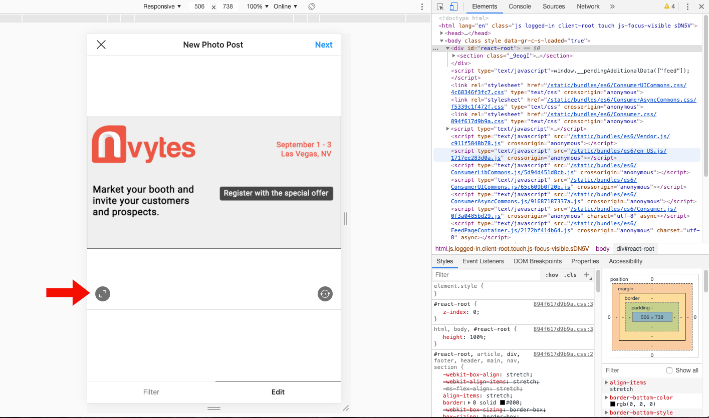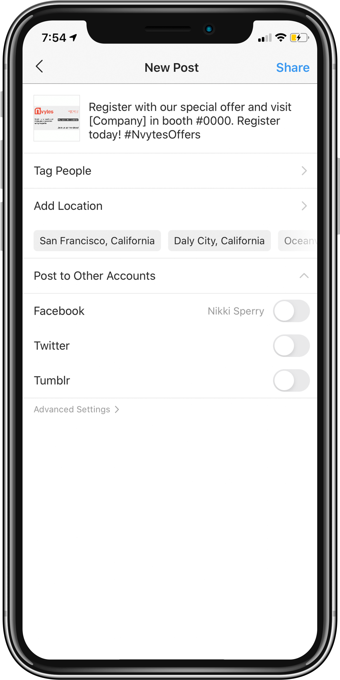When the toolbar pops up at the bottom, you can then post on Instagram. Click the “+” sign at the bottom to browse your files for the show-branded image.