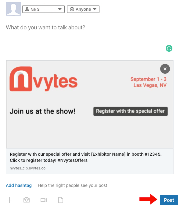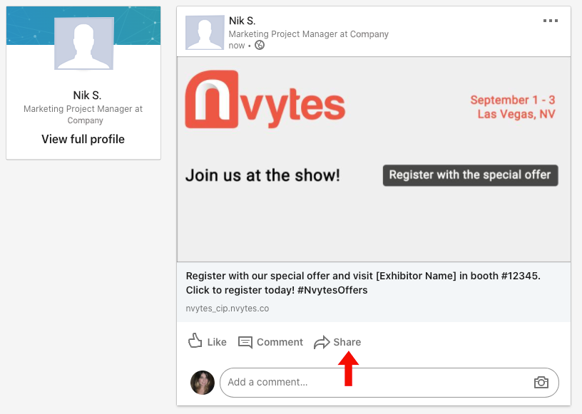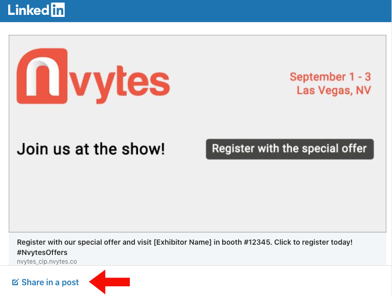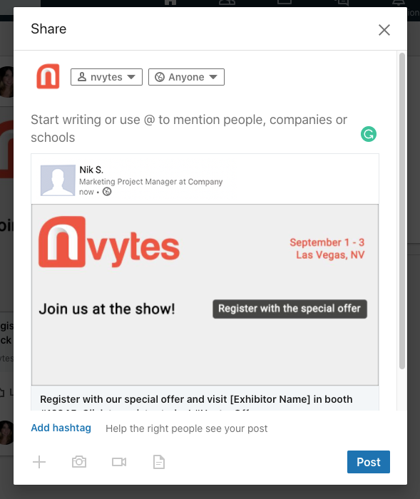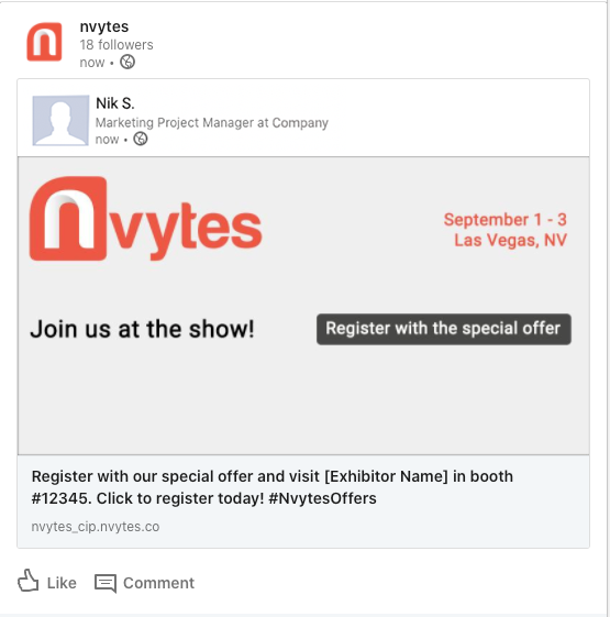 The post will generate on your company page. Your followers can easily register for the event with the special offer!
