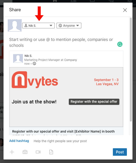 To post on LinkedIn, click the LinkedIn tile on your Invitation Dashboard. A share window will pop up with a preview of the post. Click “Share in a post” to customize your post.