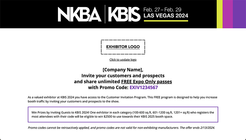 Win Prizes by Inviting Guests to KBIS 2024! One exhibitor in each category (100-600 sq.ft, 601-1200 sq.ft, 1201+ sq.ft) who registers the most attendees with their code will be eligible to win $2500 to use towards their KBIS 2025 booth space.